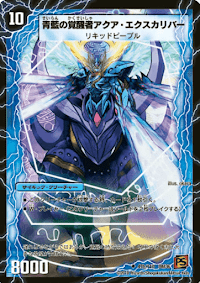《青藍の覚醒者アクア・エクスカリバー》は、中盤では高いパワーと攻撃時のドロー効果でビート向きの性能をしている覚醒クリーチャーだ。素早く《時空の剣士アクア・カトラス》から覚醒できれば、盤面テンポを取りながらビート展開を有利に進められる。