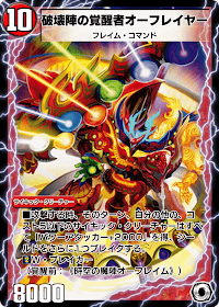 《時空の魔陣オーフレイム》 フレイム・コマンド■覚醒-このクリーチャーが相手プレイヤーを攻撃してブロックされなかった時、そのターン、バトルゾーンにある自分の他のコスト5以下のサイキック・クリーチャーはすべて、「パワーアタッカー+2000」を得、シールドをさらに1枚ブレイクする。その攻撃の後、このクリーチャーをコストの大きいほうに裏返す。(攻撃中、「パワーアタッカー+2000」を得たクリーチャーのパワーは+2000される) (ゲーム開始時、サイキック・クリーチャーは山札には含めず、自分の超次元ゾーンに置き、バトルゾーン以外のゾーンに行った場合、そこに戻す) |