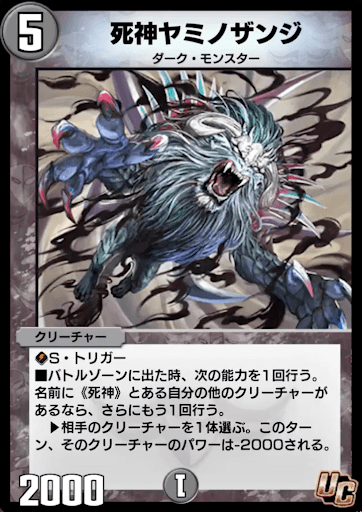 《死神ヤミノザンジ》は、登場時にパワーダウン効果を発揮できるトリガー獣だ。場に死神獣がいると、相手のパワー2000以下クリーチャーを2体破壊する複数除去か、パワー4000以下のクリーチャーを除去できる単体除去運用の使い分けが可能になる。