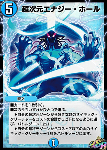 | ■カードを1枚引く。 ■次のうちいずれかひとつを選ぶ。 ▼自分の超次元ゾーンから好きな数のサイキック・クリーチャーをコストの合計が5以下になるように選び、バトルゾーンに出す。 ▼自分の超次元ゾーンからコスト7以下の水のサイキック・クリーチャー1枚をバトルゾーンに出す。 |