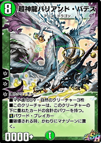 《超神龍バリアント・バデス》は、進化元にしたクリーチャーの攻撃力を、吸収できるマナ進化獣だ。ドラゴンとジャイアント種族は、全体的に高パワーなため相性が良い。