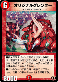 《オリジナルグレンオー》は、マナのオリジン獣だけコストが軽減されるクリーチャーだ。ブロッカー破壊の効果も持ち合わせているため、大幅にコスト軽減による召喚でブロッカーを除去した後は、2回攻撃を仕掛けられる《火ノ鳥カゲキリ》の進化元にし、シールドを多く削りに行こう。