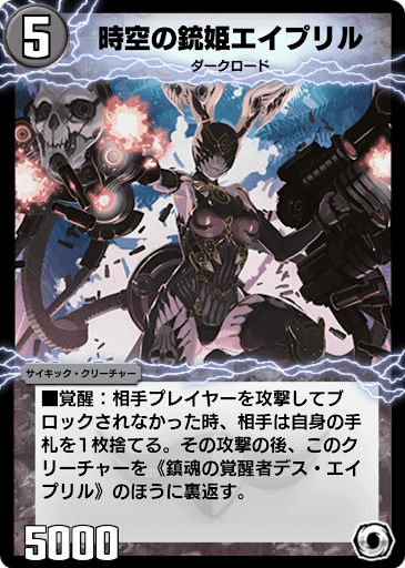 《鎮魂の覚醒者デス・エイプリル》 ダークロード■攻撃する時、相手は自身の手札を1枚捨てる。 ■W・ブレイカー (覚醒前:《時空の銃姫エイプリル》) |