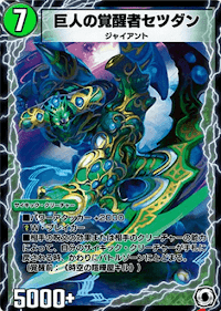 《巨人の覚醒者セツダン》は、味方のサイキック獣にバウンス耐性を付与できる効果を持つサイキック獣だ。覚醒前の《時空の喧嘩屋キル》と比べ、相手ターン中のみという制限が外れており、トリガーによるバウンス効果も無効にできるため、盛んに攻撃が可能になる。