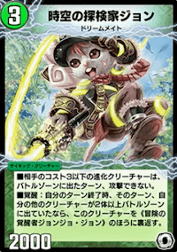 《時空の探検家ジョン》は場にいる間、低コスト進化獣の攻撃を一時的に止められるサイキック獣だ。速攻デッキに採用の多い、《密林の総督ハックル・キリンソーヤ》や《火ノ鳥カゲキリ》と言った低コスト進化獣に対して高いメタ性能を発揮できる。