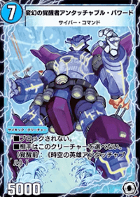 《時空の英雄アンタッチャブル》 キカイヒーロー■自分のクリーチャーを相手が選ぶ時、このクリーチャーは選べない。(ただし、このクリーチャーを攻撃またはブロックしてもよい) ■覚醒 :各ターンの終わりに、自分の他のサイキック・クリーチャーがそのターン覚醒していたら、このクリーチャーをコストの大きいほうに裏返す。 (ゲーム開始時、サイキック・クリーチャーは山札には含めず、自分の超次元ゾーンに置き、バトルゾーン以外のゾーンに行った場合、そこに戻す) |