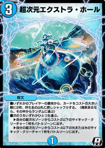 《超次元エクストラ・ホール》は、プレイヤーのどちらかを選択し、墓地のカードをデッキに戻せる効果を持った超次元呪文だ。戻す墓地はプレイヤーが選択できるため、自身を選択しデッキの切り札を再利用したり、相手の墓地選択して肥やしを妨害できる。