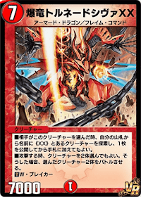 《爆竜トルネードシヴァXX》は、「バトルさせる」効果を持ったカードの中でも汎用性の高い能力を持ったクリーチャーだ。類似効果の《チェーン・デスマッチ》とは違い、自分と相手のクリーチャーだけではなく、相手クリーチャー同士、もしくは自分自身のクリーチャー同士をバトルさせられる。パワーの同じ相手クリーチャー同士をぶつければ、二面処理も可能だ。また、相手盤面に何も無い状況でも《時空の火焔ボルシャック・ドラゴン》の覚醒を、味方クリーチャーで達成するなどの使い方ができる。