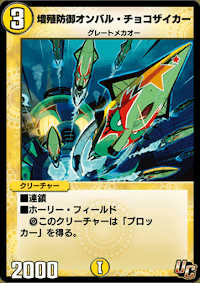 《増殖防御オンバル・チョコザイカー》は、連鎖によって小型獣を横に展開しながら、自身はブロッカーで壁を築ける小型メカオーだ。自身のコストが軽量なため、連鎖によって展開できるクリーチャーの範囲は狭い。軽量コストのクリーチャーを中心に構築される、速攻系のデッキで活躍を期待できる。