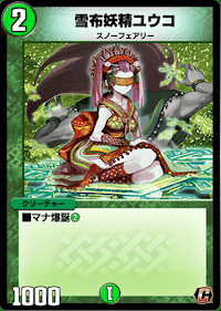 《雪布妖精ユウコ》は、マナ爆誕効果を持つスノーフェアリーだ。強力な効果を持つ進化獣の《ダイヤモンド・ブリザード》と組み合わせれば、盤面や手札がなくともマナ爆誕で《雪布妖精ユウコ》を進化元にし、リソースを多く回復できるプレインが可能になるため、相性の良いカードである。
