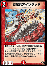 《百足兵アインラッド》は、マーシャル・タッチ能力を持ったクリーチャーの召喚コストを軽減サポートできる初動札として優秀なクリーチャーだ。2ターン目《百足兵アインラッド》の召喚から、コスト軽減された《アラゴト・ムスビ》を召喚してマナ加速するなどの使い方が基本になる。