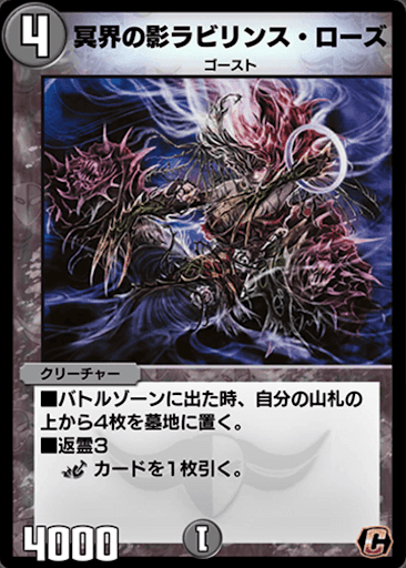 《冥界の影ラビリンス・ローズ》は、登場時に墓地肥やし効果を発揮できるため、効果の遅延なく安定して墓地を肥やせる。同じ効果を持つ《黒神龍ハルヴェルド》とは違い、自身の持つ返霊効果で墓地のカードをデッキに戻せるため、デッキアウトの心配をせずに効果を発揮させられる扱いやすいクリーチャーだ。