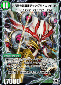 《大見得の覚醒者ジャングル・カンクロウ》は、味方にブロックされない効果を付与して、ビート時相手の妨害を防ぐ効果を持ったクリーチャーだ。ブロックされない効果は味方クリーチャーのパワーラインに依存するため、《超覚醒ラスト・ストームXX》などの効果で大型獣を大量展開したリーサルターンなどで猛威を発揮する。