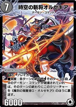 | ■W・ブレイカー ■覚醒:各ターンの終了時、そのターンに自分のデーモン・コマンドが破壊されていれば、そのターンの終わりにこのクリーチャーを《魔刻の覚醒者G・オルゼキア》のほうに裏返す。 |
