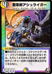 《聖黒獣アシュライガー》は、「エンジェル・コマンド」と「デーモン・コマンド」の召喚コストを軽減できる種族サポート獣だ。自身が多色獣故にコスト軽減効果を持つ《聖騎士ヴォイジャー》と比べ、色事故の可能性が上がるが、2種族のコストを軽減できる分活躍できるデッキの幅が広い。