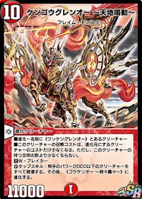 《ケングレンオー ~出発~》C フレイム・モンスター■タップスキル:自分の山札から《ケンゲキオージャ ~究極火焔~》1枚を公開し、《ワンケングレンオー ~月下咆哮~》としてこのクリーチャーの上に置く。その後、山札をシャッフルする。 |