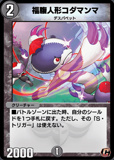 『デュエプレ(デュエマプレイス)』の「福腹人形コダマンマ」の評価と採用デッキについて紹介。カードの効果や特徴、生成・分解コスト、関連カードなども掲載しているため、カード生成の参考にどうぞ。