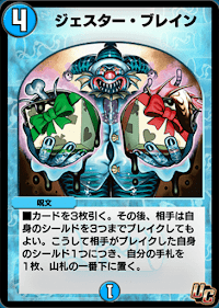 《ジェスター・ブレイン》はカードを3枚引いた後、相手にシールドを削れる選択肢を与え、削った分自身の手札をデッキに戻すリソース札だ。相手が3枚シールドを戻したとしても、実質トリプルブレイクしつつ手札入れ替えを行えるため、高い確率でアドバンテージを稼げる。