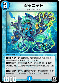 《ジャニット》は、登場時に相手の軽量クリーチャーをバウンス除去できる効果を持ったクリーチャーだ。序盤盤面の取り合いで有利に立ちやすい効果と言える。また、擬似的なS・トリガーも獲得可能で、デッキの防御面もカバーする役割も持たせられる。