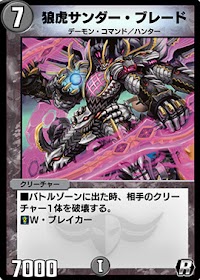 《狼虎サンダー・ブレード》は、登場時に相手獣を除去できるハンター獣だ。ハンターデッキでは《デーモン・ハンド》等で確定除去を狙うよりも、盤面に残る《狼虎サンダー・ブレード》の方が、ハンター獣特有のハンティング能力を引き出せる。