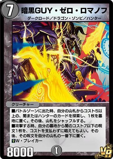 《暗黒ガイ・ゼロ・ロマノフ》は、登場時にハンターか闇のカードを墓地に送り、攻撃時に墓地からコスト7以下の呪文を唱えられるハンター版ロマノフだ。墓地蘇生効果を持った《ミラクル・リ・ボーン》や《地獄門デス・ゲート》と言った、カードと組み合わせ盤面展開を狙おう。