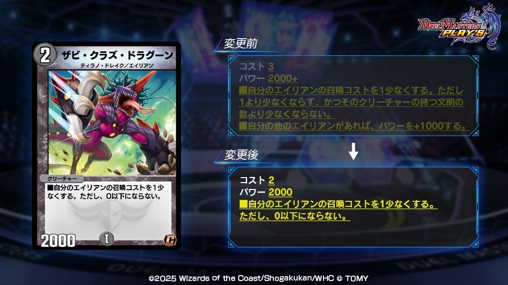 このカードをプレイする時支払うコストは、自分の指定されたカード1枚につき2少なくなる。ただし、コストはそのカードの持つ文明の数より少なくならない。