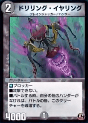 《ドリリング・イヤリング》は、2コストで高パワーを所持しているブロッカー獣だ。元となった《ブラッディ・イヤリング》と違い、自身の場にハンター獣がいればバトル後も破壊されないため、ハンターデッキの防御札として使おう。