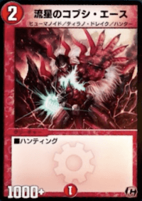 《流星のコブシ・エース》は、バトル時にパワーバフを発揮できるハンティング能力を持つ小型獣だ。ハンター獣のコスト軽減を行える《ヤッタレ・ピッピー》と組み合わせ、盤面展開を行いパワーバフを最大限発揮しよう。