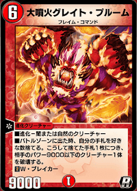 《大噴火グレイト・プルーム》は、登場時に自身の手札を捨てた枚数だけ破壊効果を発揮できる進化獣だ。登場時に手札を消費してしまう能力のカバーを行えるように、リソース補充を行うデッキで使おう。