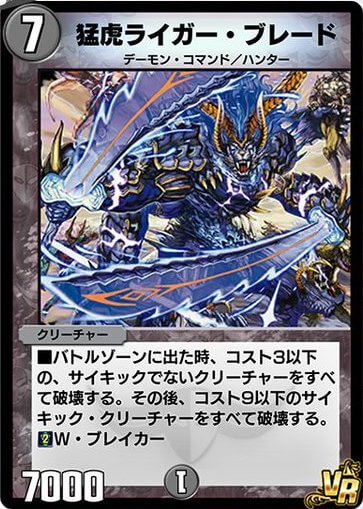 《猛虎ライガー・ブレード》は、登場時にコスト9以下のサイキック獣を全て破壊できる効果を持つハンター獣だ。自身のサイキック獣も破壊してしまうため、サイキック獣を扱わないデッキで使おう。