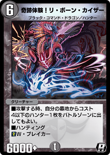 | ■攻撃する時、自分の墓地からコスト4以下のハンター1枚をバトルゾーンに出してもよい。 ■ハンティング ■W・ブレイカー |