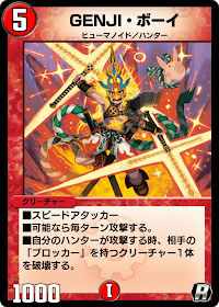 《GENJI・ボーイ》は、自身のハンター獣に攻撃時ブロッカー破壊効果を付与できる。《ヘブンズ・ゲート》が流行った際に採用し突破力をつけよう。