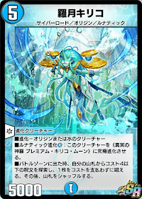 | ■進化-オリジンまたは水のクリーチャー ■ルナティック進化(水/8):このクリーチャーを《真実の神羅 プレミアム・キリコ・ムーン》に究極進化させる。 ■バトルゾーンに出た時、自分の山札からコスト4以下の呪文を探索し、1枚をコストを支払わずに唱える。その後、山札をシャッフルする。 |
