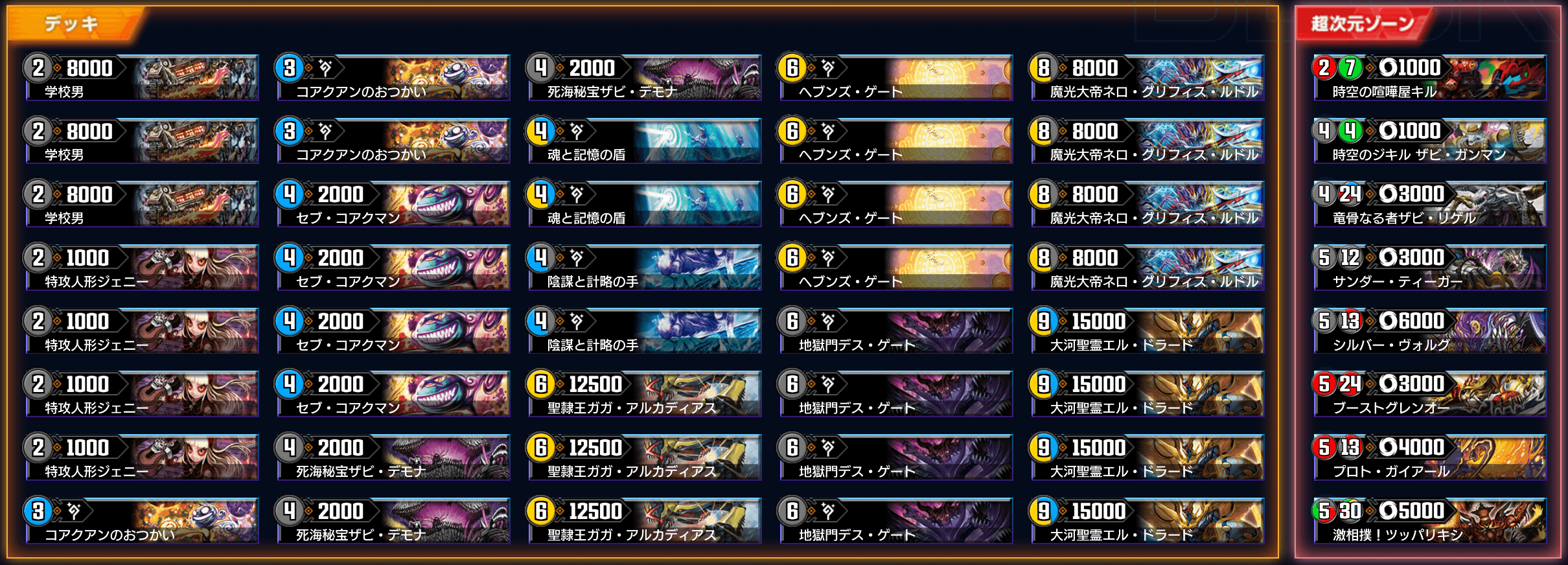 エイリアンなどの自壊効果が多いクリーチャーを採用し、《ネロ・グリフィス・ルドルフ》の本領を発揮しやすくした天門デッキ。通常の「ドロマー天門」に比べ、《ガガ・アルカディアス》への呪文ロック耐性や安定したドローソースが特徴だ。