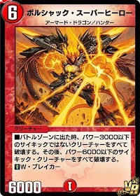 | ■バトルゾーンに出た時、パワー3000以下のサイキックではないクリーチャーをすべて破壊する。その後、パワー6000以下のサイキック・クリーチャーをすべて破壊する。 ■W・ブレイカー |