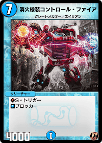 『デュエプレ(デュエマプレイス)』の「消火機装コントロール・ファイア」の評価と採用デッキについて紹介。カードの効果や特徴、生成・分解コスト、関連カードなども掲載しているため、カード生成の参考にどうぞ。