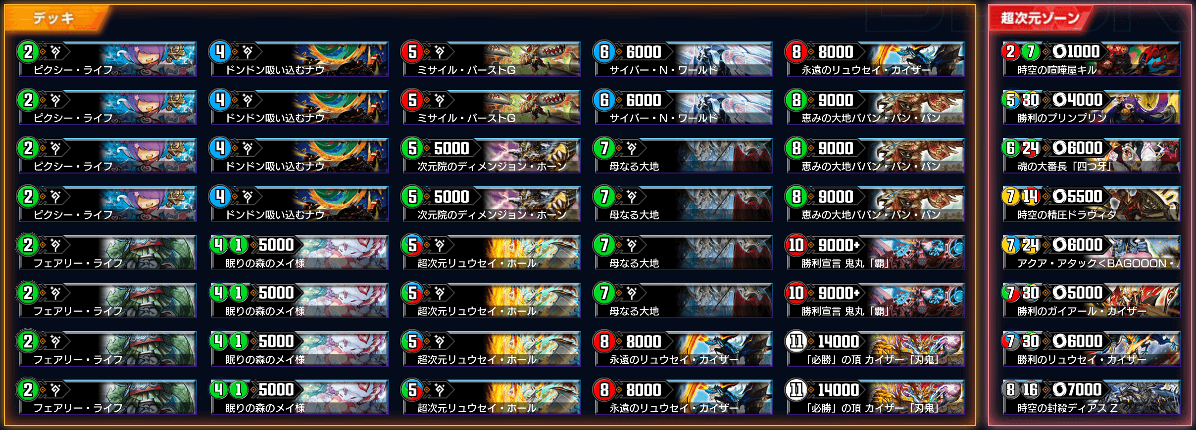 終盤は《ババン・バン・バン》の着地でマナを激増。《永遠のリュウセイ・カイザー》でスピードアタッカーを付与された《ディメンジョン・ホーン》のタップ効果を使い、《ヴァーミリオン・ドラヴィタ》など覚醒サイキック獣を展開し、盤面を制圧する。