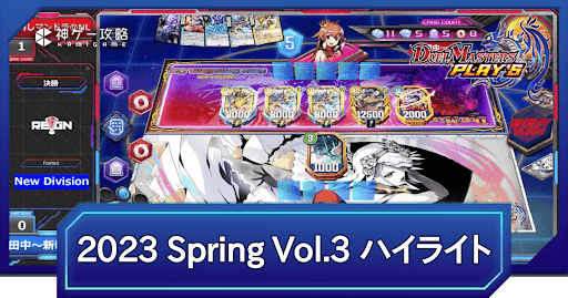 『デュエプレ(デュエマプレイス)』2022年2月5日に開催された『REIGN DMPS VERTEX CUP 2023 Spring vol.3』の大会決勝トーナメントのレポートを掲載。大会のハイライト、おおよその試合の様子や大会結果、今大会におけるキーカードを掲載しているので、ぜひ参考にどうぞ。