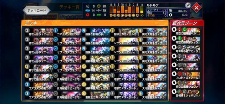 | 先程の話にも繋がるのですが、フォーエバープリンセスを入れているシータNエクスや、黒抜き4cメンチは警戒していました。 あと自分自身ミラーが苦手ということもあってルドルフ天門と対面した時に呪文で処理できないベルリンを処理する為にガガ・コロリンを多めに入れていました。 |
