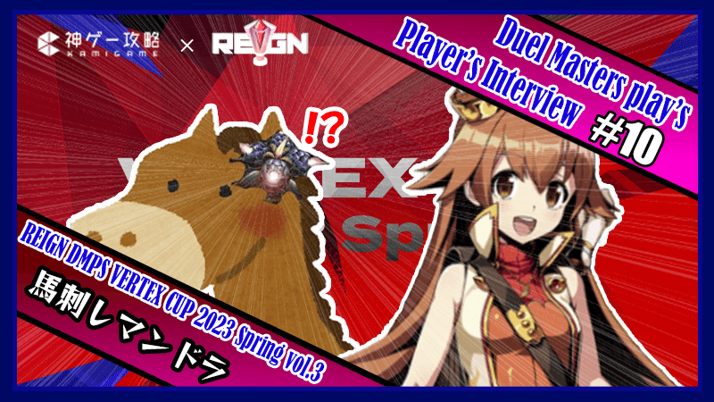 今回はデュエルマスターズプレイスの公認大会「REIGN DMPS VERTEX CUP 2023 Spring vol.3」で優勝したプレイヤー「馬刺しマンドラ」選手にインタビューを実施!印象的な試合や普段のプレイングについて聞いたので参考にどうぞ!