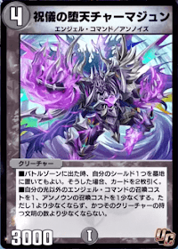 《祝儀の堕天チャーマジュン》は、光以外のエンジェル・コマンドのコスト軽減効果を持ったクリーチャー。また、自身もコスト軽減効果に適応するため、《祝儀の堕天チャーマジュン》を複数展開し大幅にコストを軽減させるプレイグも可能だ。