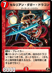 | ■W・ブレイカー ■バトルゾーンに出た時、自分のドラゴン1体につき1枚、カードを引く。(手札の上限枚数を超えるなら、上限枚数に達するまで引く) |