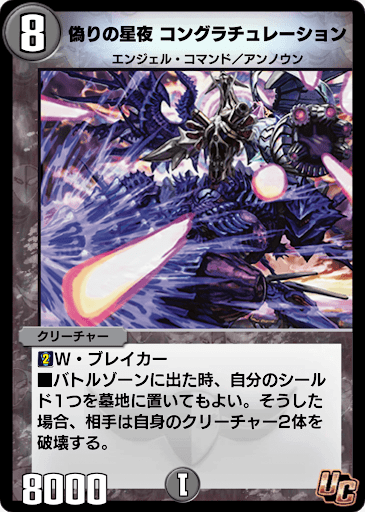 《偽りの星夜 スター・イン・ザ・ラブ》VR エンジェル・コマンドアンノウン■T・ブレイカー ■バトルゾーンに出た時、エンジェル・コマンド以外のクリーチャーをすべて破壊してもよい。そうした場合、自分のシールドをすべて墓地に置く。 ■自分のシールドが1つもなければ、自分の他のエンジェル・コマンドはすべて「ブロッカー」を得る。 |