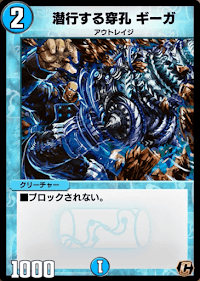 《潜行する穿孔 ギーガ》は、《腐敗電脳メルニア》や《キャンディ・ドロップ》同様にブロック貫通効果を持つクリーチャーだ。殴り返しには弱いものの、ブロッカーを持つトリガー獣を無効化できるため、速攻デッキのフィニッシャーとして扱える。