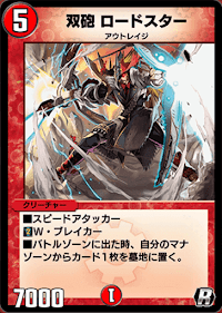 | ■スピードアタッカー ■W・ブレイカー ■バトルゾーンに出た時、自分のマナゾーンからカード1枚を墓地に置く。 |