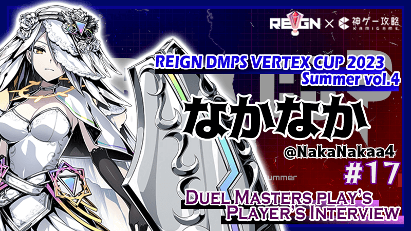 今回はデュエルマスターズプレイスの公認大会「REIGN DMPS VERTEX CUP 2023 Summer vol.4」で優勝したプレイヤー「なかなか」選手にインタビューを実施!印象的な試合や普段のプレイングについて聞いたので参考にどうぞ!