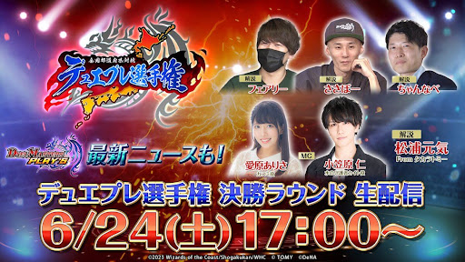『デュエプレ(デュエマプレイス)』の2023年6月24日配信デュエプレ選手権公式生放送で配信予定の情報をまとめている。デュエプレ選手権の決勝トーナメント結果や第2弾『五等分の花嫁』コラボ続報、最新ニュースをまとめているので、ぜひ参考にどうぞ。