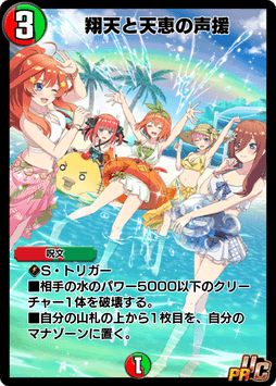 | 各ターン、初めて二乃のサイキックでないクリーチャーが破壊された時、ゲーム外からランダムなコスト6以下のサイキック・クリーチャーをバトルゾーンに出す。 |
