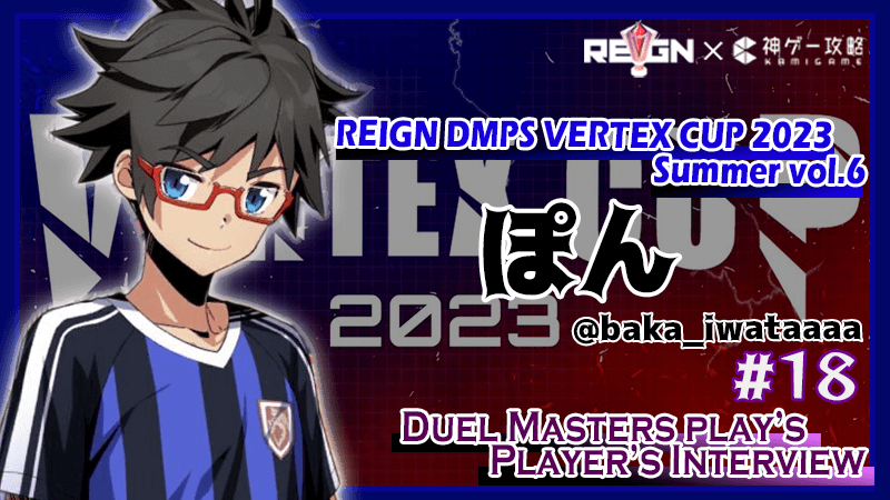 今回はデュエルマスターズプレイスの公認大会「REIGN DMPS VERTEX CUP 2023 Summer vol.6」で優勝したプレイヤー「ぽん」選手にインタビューを実施!印象的な試合や普段のプレイングについて聞いたので参考にどうぞ!