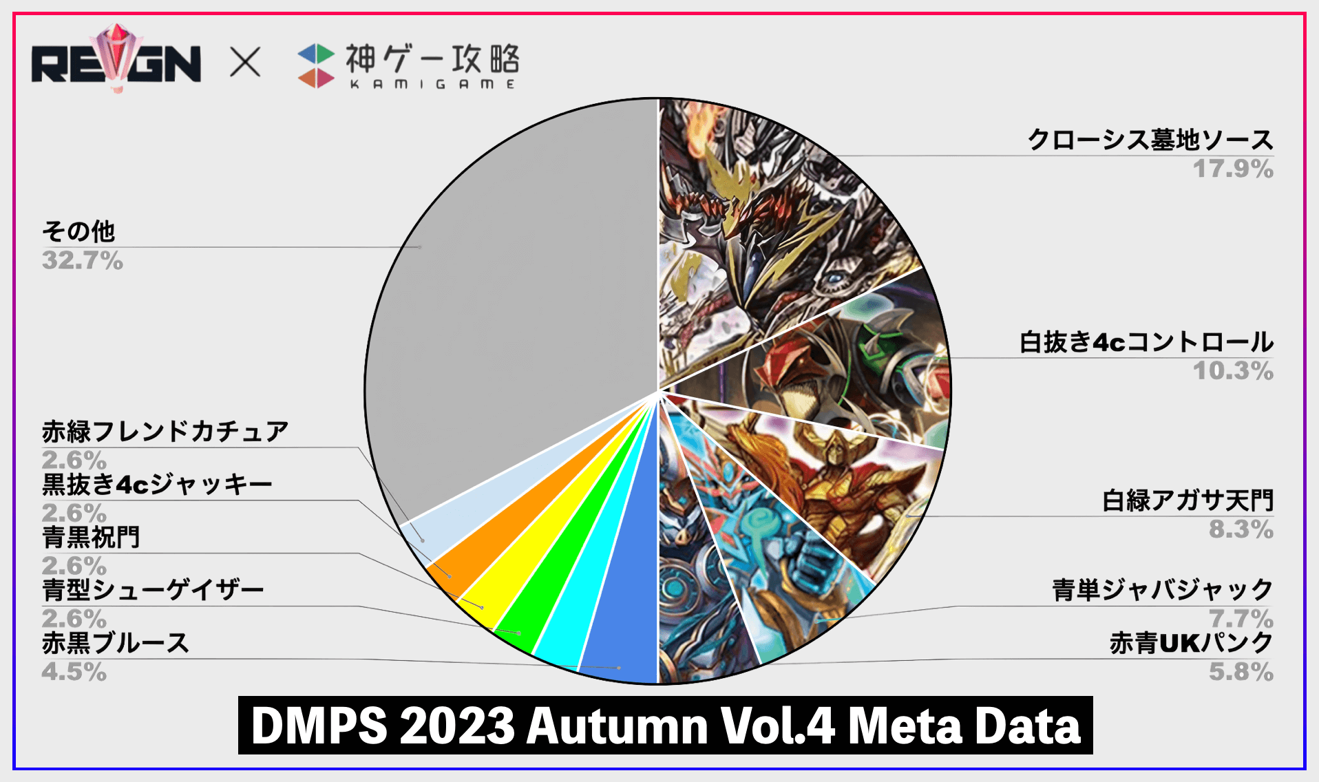 『デュエプレ(デュエマプレイス)』の2023年8月18日に開催された『REIGN DMPS VERTEX CUP 2023 Autumn vol.4』の大会参加者デッキのメタデータを掲載。大会の優勝デッキや環境考察も掲載しているので、ぜひ参考にどうぞ。